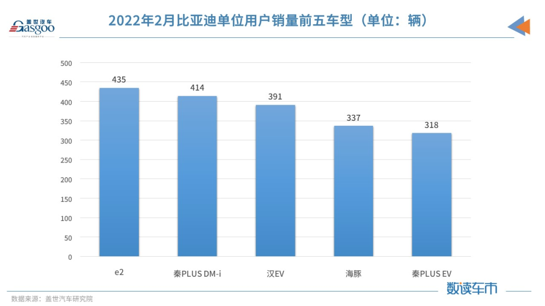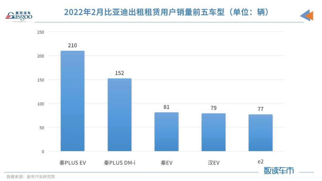 而在出租租赁和单位用户方面,这两类用户虽占比亚迪份额较小,但其销量基数较大的情况下,这两类用户的终端销量并不少。数据显示,2月比亚迪单位用户终端销量为3521辆,其中单位用户上险车型的前五个依次是比亚迪e2、秦PLUS DM-i、汉EV、海豚、秦PLUS EV。