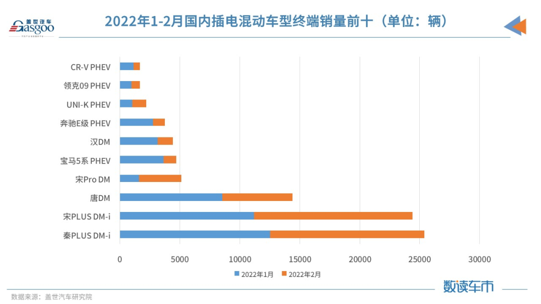 另外,比亚迪终端销量走高背后不仅是产品数量的变化,还与单一车型终端热销的状态有关。举例来说,今年1-2月,秦PLUS DM-i和宋PLUS DM-i单月终端销量均超过1.1万辆,这两款车型在国内插电混动市场位居前两位,两款车型相加已占插电混动市场47%的份额。另外在插电混动市场前十车型销量排名中,比亚迪有5款插混车型入围,而这5款车型共占据国内插混市场约70%的份额。一个无需争议的事实是,比亚迪DM-i系列车型的推出继续稳固了比亚迪在插混市场的地位。