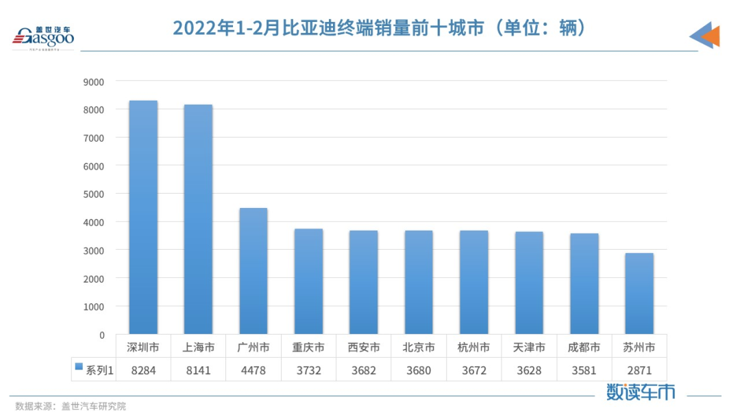 此外,就卖到哪儿而言,比亚迪有终端销量数据的城市有299个,其中销量较高的前五城市依次是深圳、上海、广州、重庆、西安,今年1-2月,比亚迪在深圳和上海终端销量均超过8000辆,其次广州也与前面两座城市有3000余辆的差距。由城市分布来看,比亚迪终端消费更偏向于一线城市及新一线城市。