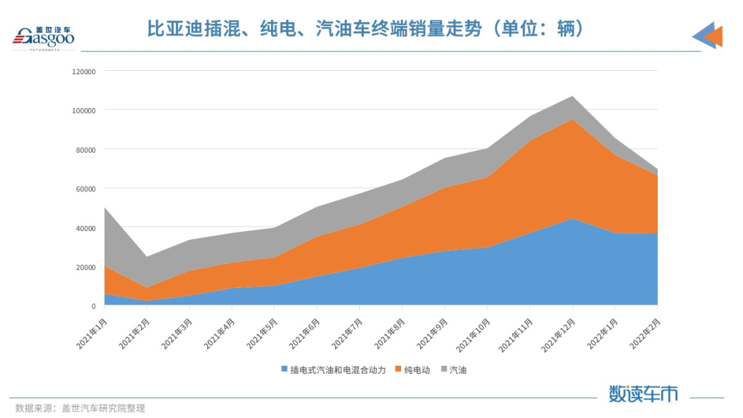根据最新的终端销量数据,比亚迪今年2月终端销量约为7.0万辆,前两月累计销量约为15.5万辆。而分类别来看,插电混动前两月销量约7.4万辆,纯电动约7.0万辆,燃油车约1.2万辆,这样来看,比亚迪的插电混动与纯电动旗鼓相当。
