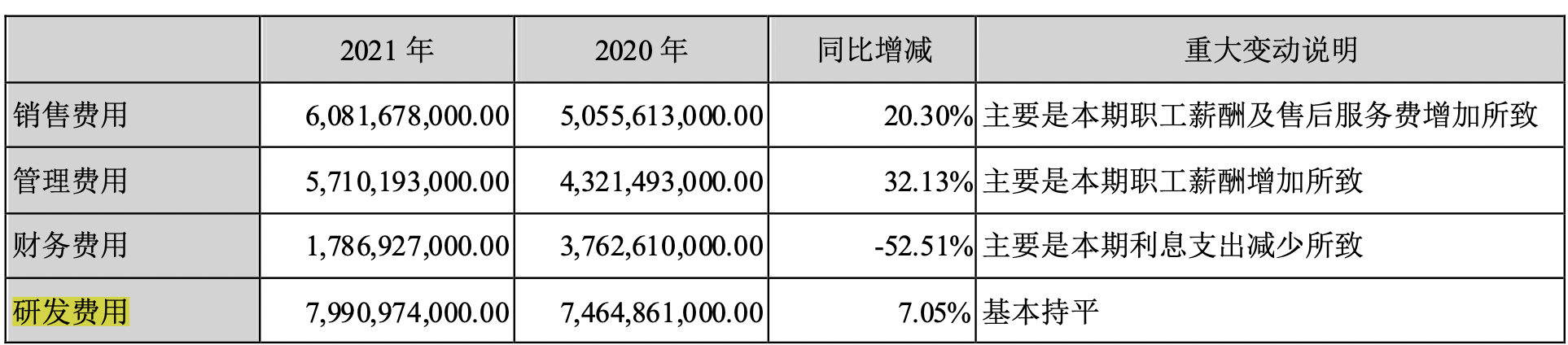 财报显示,2020年比亚迪股份研发费用达到79亿元,同比增长7%,基本与去年持平,但销售费用和管理费用增幅较大。