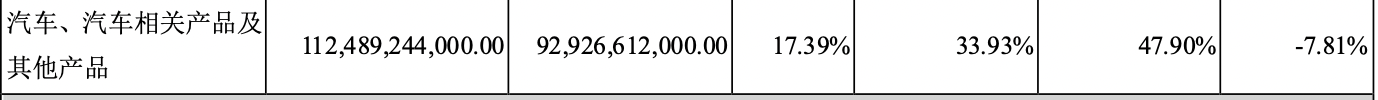 报告指出,汽车、汽车相关产品及其他产品业务的收入约人民币1124.89亿元,同比增长33.93%;毛利率为17%,同比下降7.81%。