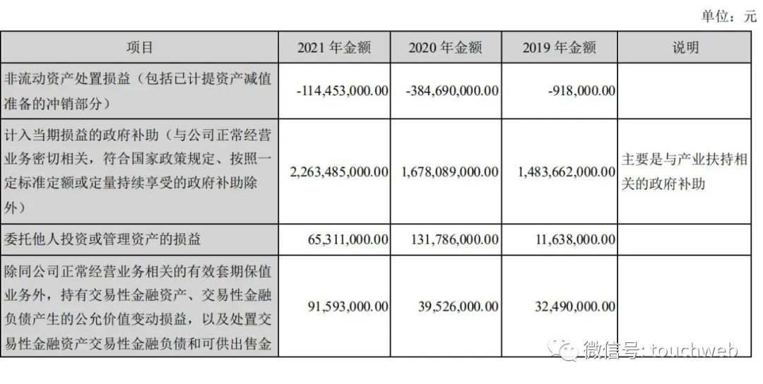 比亚迪2021年计入当期损益的政府补助为22.63亿元。2019年、2020年分别计入补助高达14.84亿元、16.78亿元。
