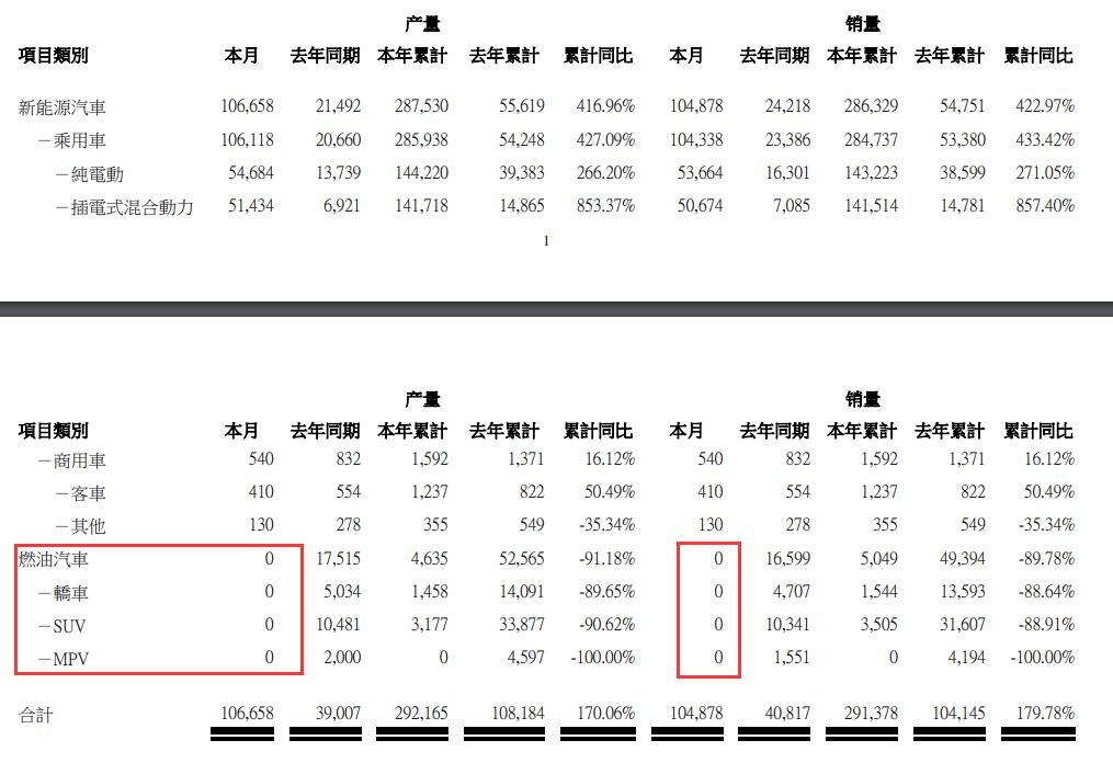 比亚迪4月3日当晚发布的3月产销快报显示,今年3月,比亚迪产销量分别为10.67万辆和10.49万辆,其中燃油车产销量均为“0”。而今年一季度,比亚迪新能源汽车的销量占总销量的比重已达到98%。