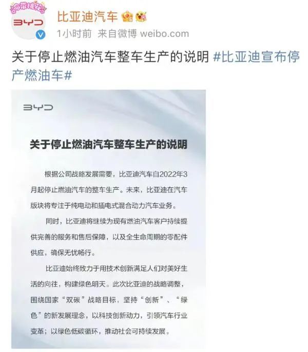 长沙晚报掌上长沙4月4日讯(全媒体记者孙占锋)“计划从2022年3月起,停止旗下燃油汽车的整车生产业务。”4月3日晚间,比亚迪在港交所公告及其官方微博等区域,宣布了停产燃油车的消息,并表示未来“将专注于纯电动和插电式混动车型的业务”。对此,业界分析认为,比亚迪此举或带动更多车企跟进。