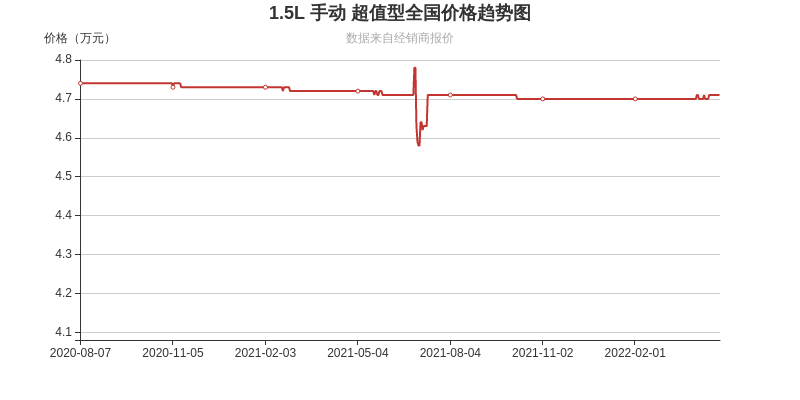 最近一年以来,比亚迪F3 1.5L 手动经典型在全国范围内的价格变化平稳,最低价格达到4.6万,最高价格达到4.8万,历史平均价格为4.7万。