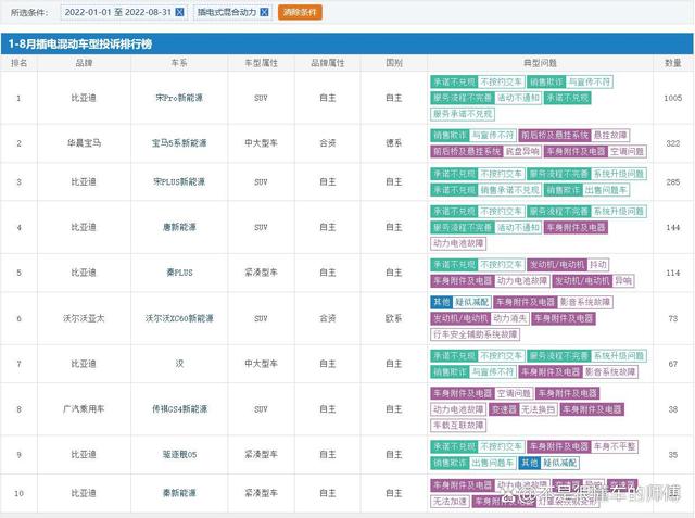据专业汽车网站数据统计,1-8月插电混动车型投诉榜单出炉,榜单前十名的各种数据让人心酸:比亚迪大翻车,宝马添乱!