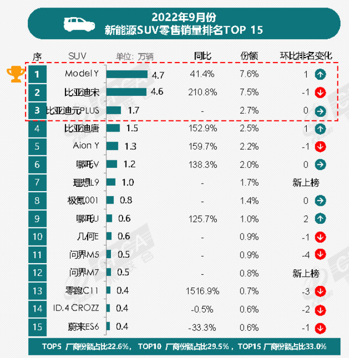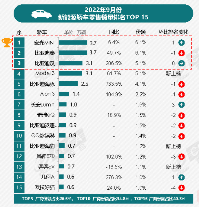 轿车方面,2022年9月Aion S 销量同比增长破100%,略低比亚迪海豚这匹黑马一筹,但也处在榜单前列。