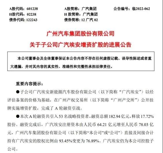 而就此前在埃安刚结束的A轮融资中,53家豪华阵容投资机构参与共计完成了182.94亿融资。该笔融资作为近年来国内新能源整车行业公开可查的最大单笔私募融资,全面覆盖了电池供应链、半导体、车路协同、能源生态、资产投行等全产业链协同企业,与埃安实现了一场百亿级的上下游产业深度绑定。