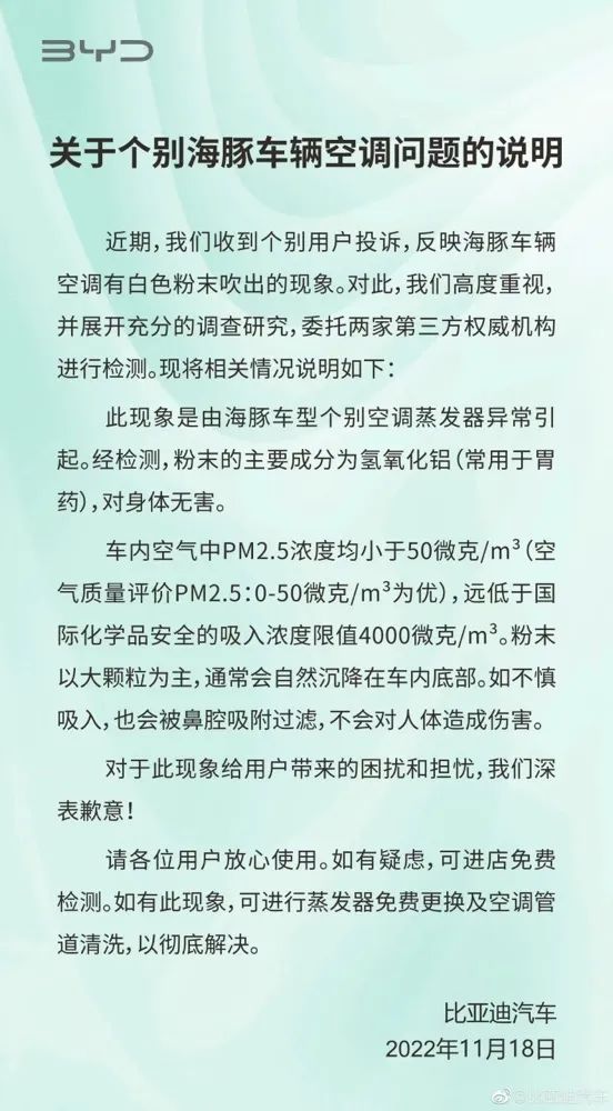 11月18日,比亚迪在官微发布“关于个别海豚车辆空调问题的说明”,称经检测,此现象是由海豚车型个别空调蒸发器异常引起,“粉末的主要成分为氢氧化铝(常用于胃药),对身体无害”。