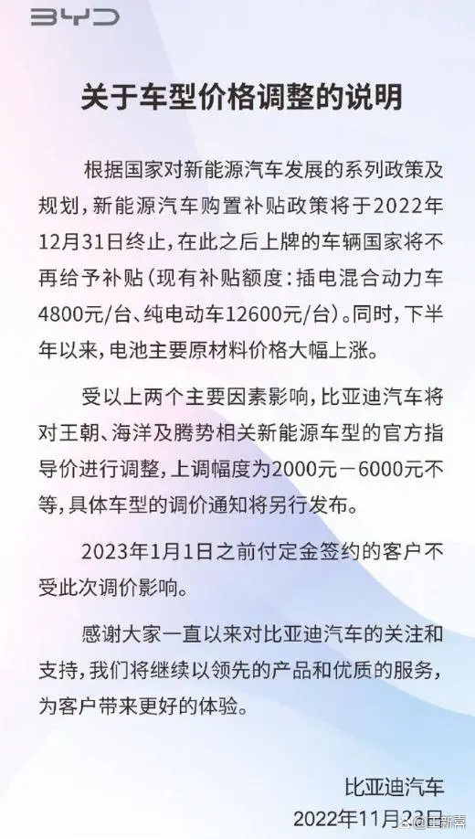 关于比亚迪涨价的理由,按照比亚迪自身的说法是,是因为电池主要原材料成本上涨了,而且国家对新能源汽车不再补贴,所以整车就要跟着涨价。