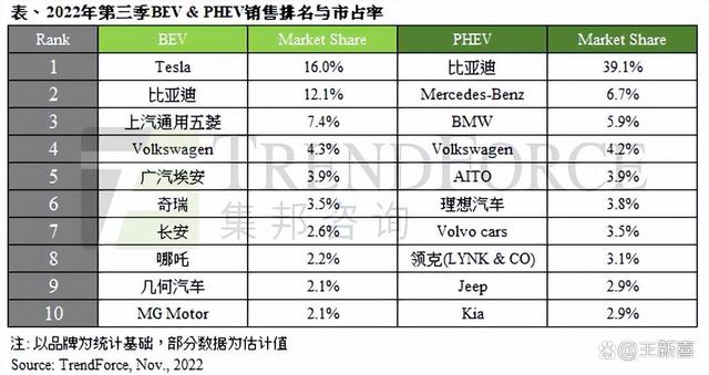 根据TrendForce集邦咨询统计,2022年第三季新能源车(包含纯电动车、插电混合式电动车、氢燃料电池车)销售总量为287万辆,年成长70%。纯电动车方面,第一名的特斯拉销量34.4万辆,市占率维持在16%,但与第二名的比亚迪距离再次拉近,比亚迪第三季销售25.9万辆纯电动车,较去年同期成长182%。