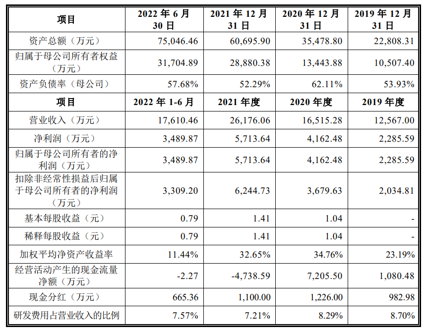 报告期内,双元科技的营业收入为1.26亿元、1.65亿元、2.62亿元和1.76亿元;净利润为2285.59万元、4162.48万元、5713.64万元和3489.87万元。