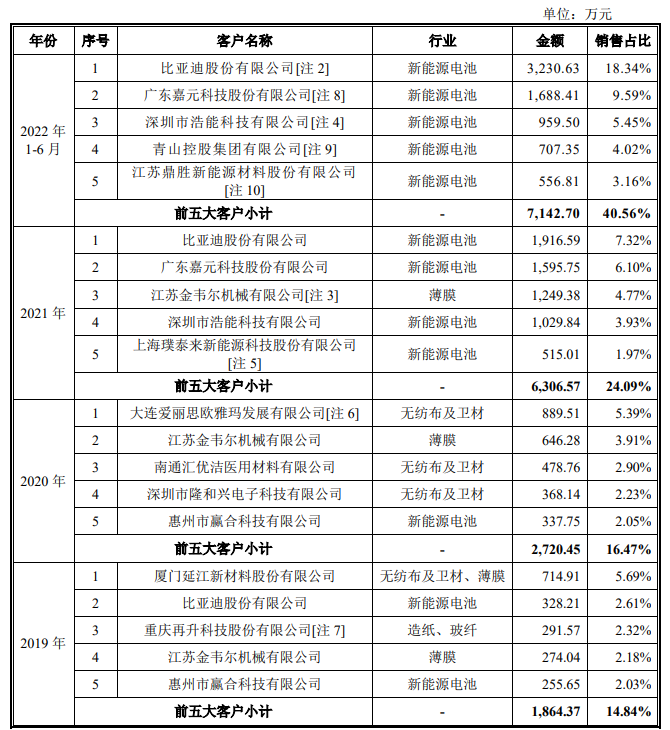 截至2022年10月28日,公司新能源电池业务在手订单中前五大客户占比为68.74%,客户集中度较高。其中,蜂巢能源系公司股东无锡蜂云能创的有限合伙人,其持有无锡蜂云能创73.08%的股份,并间接持有公司1.86%的股份。预计未来一段时间内,公司在新能源电池领域仍会对比亚迪、蜂巢能源等大客户存在一定的依赖。