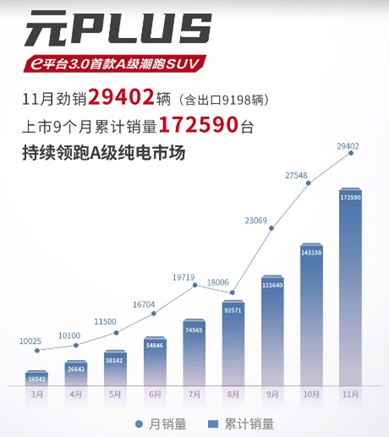 11月,比亚迪元PLUS销量为29402辆,其中海外销量9198辆,上市9个月累计销量172590辆。