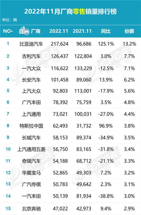 具体来看,国内厂商销冠仍为“比亚迪”汽车,11月份卖出217,624辆,同比暴增125.1%,相比去年同期销量已翻倍,国内市场份额也达到了13.2%的高度。