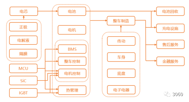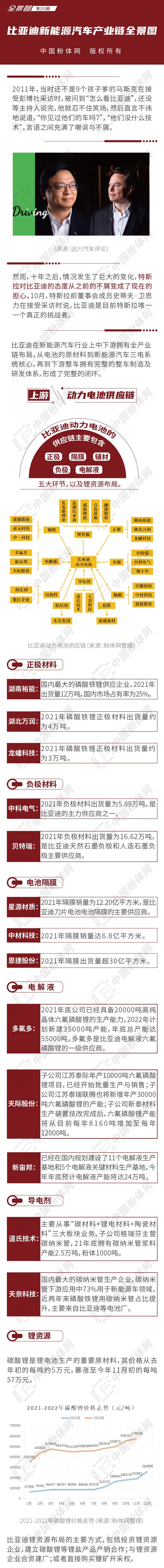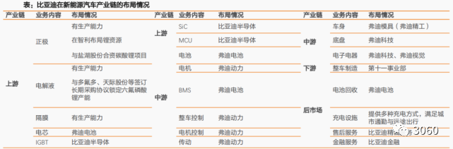 比亚迪在新能源汽车行业拥有全面的产业链布局,贯穿产业的上、中、下游以及后市场。公司的产业链布局范围从电池原材料到三电系统到整车设计制造再到电池回收和汽车服务,形成了完整的产业链闭环。
