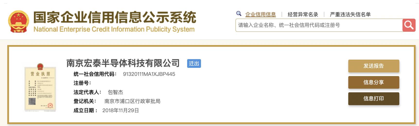 南京宏泰半导体成立于2018年11月29日,法定代表人为包智杰,注册资本约5549.09万元,经营范围包含:半导体、仪器仪表、自动化成套控制装置系统研发、制造、销售等。该公司大股东为上海宏测企业管理中心(有限合伙),持股约25.42%。