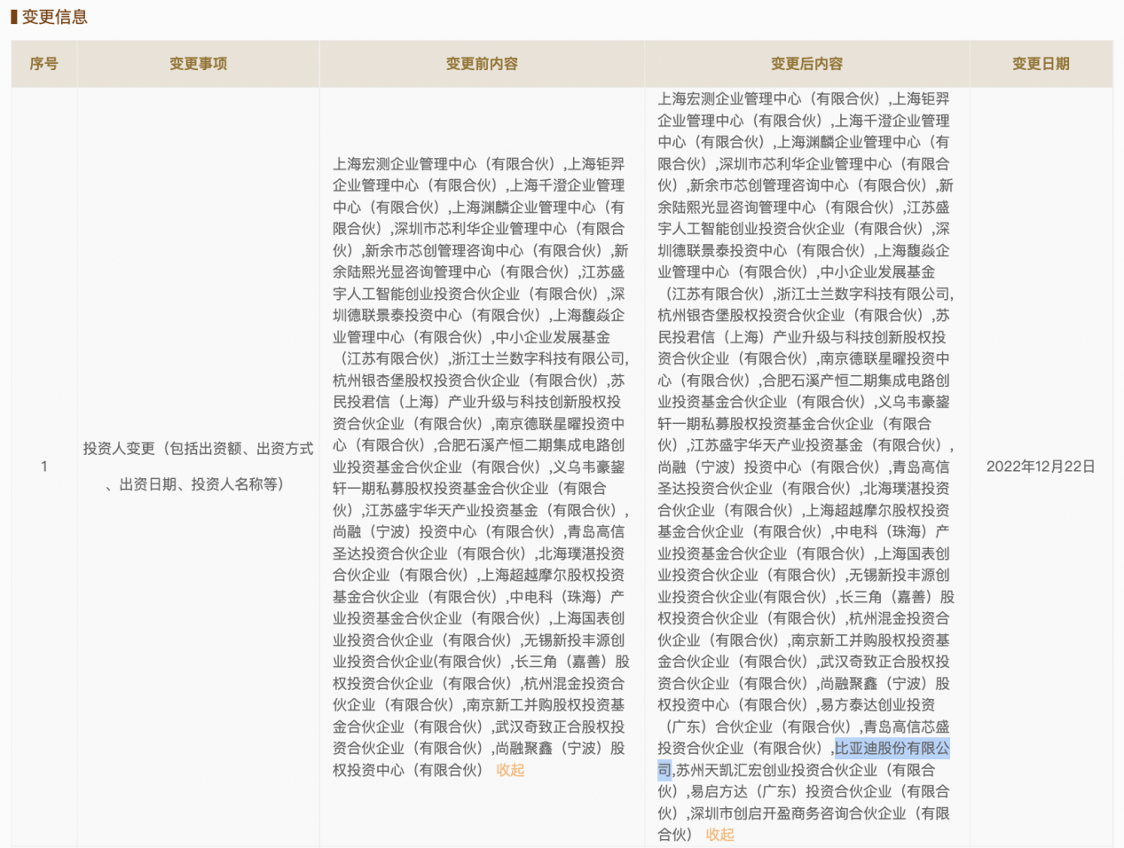12月23日,比亚迪股份有限公司(以下简称:比亚迪)新增投资企业南京宏泰半导体科技有限公司(以下简称:南京宏泰半导体),投资比例为2.2295%。