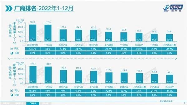 今天一张榜单公布,乘联会公布了《2022年12月份全国乘用车市场分析》,其中公布了2022年全年各大汽车厂商销量排名,比亚迪位居第一刚刚过去的2022年,比亚迪夺得中国车市销冠,终结了中国车市销冠长期被合资品牌“霸榜”的历史。