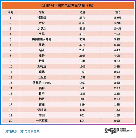 以2022年12月份欧洲14国纯电动车销量排名来看,大众、沃尔沃、宝马、奔驰、奥迪等传统欧洲品牌依然占据绝对优势。