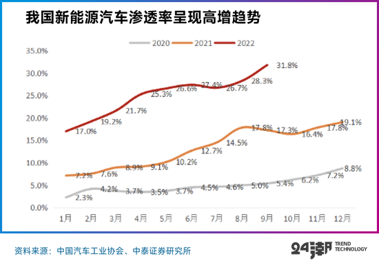 另外,据中国汽车工业协会数据,2022年11月,国内新能源汽车渗透率已攀升至33.8%,创历史新高。而这个数据在2021年1月时还仅为7.2%。