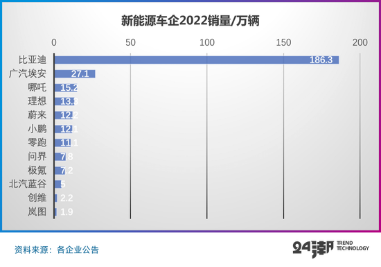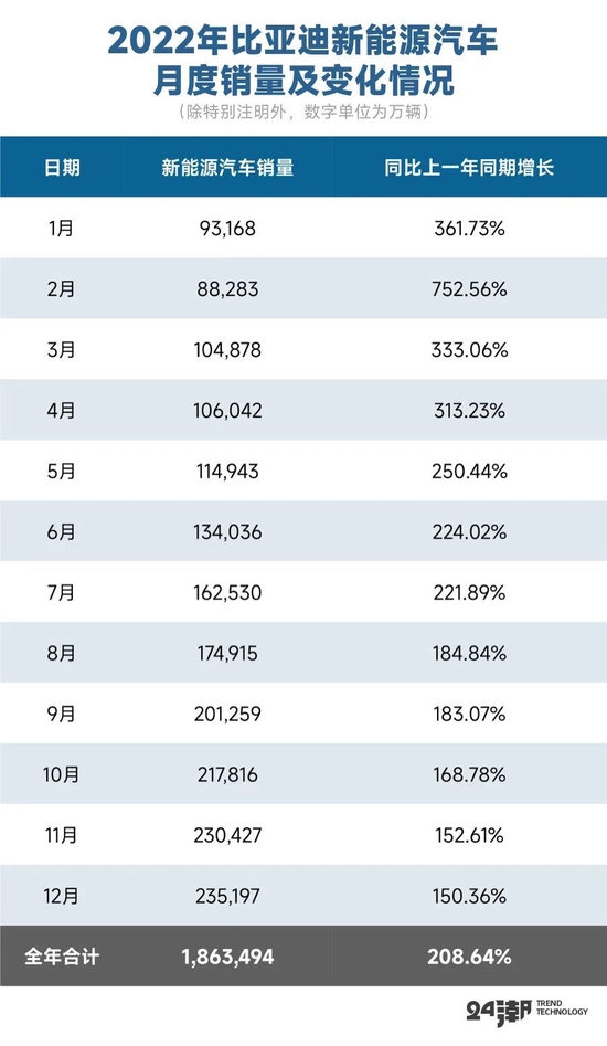 据比亚迪官方披露:2022年全年比亚迪新能源汽车总销量达186.35万辆,同比增长了208.64%;同期特斯拉销量为131万辆,同比增长40%。