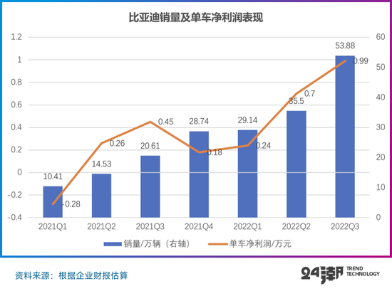 据公开数据披露,第三季度比亚迪净利润为57.16亿元,减掉比亚迪电子6.03亿元的净利润,以第三季度53.88万辆的销量计算,比亚迪单车净利润已近1万元。而在2021年第四季度比亚迪单车净利还仅为1800左右,近一年时间其单车净利润增长近450%!