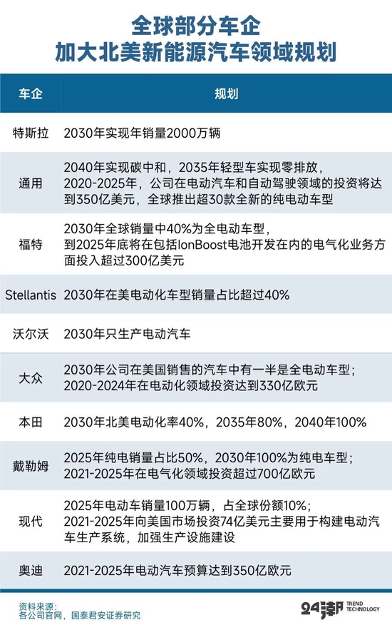 当然,行动的不只是中资车企,特斯拉、通用、大众、福特、奥迪、戴勒姆等诸多国际车企巨头也都纷纷加大在欧美等国的投资布局,计划投入资金数以百亿美元/欧元计,具体布局详见下表: