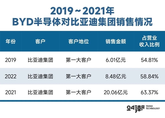 但是,我们分析比亚迪半导体招股书发现,直到2021年,比亚迪半导体公司63%的收入仍来自于比亚迪集团,其对比亚迪的依赖性甚至不降反升,对比亚迪的销售占比甚至较2020年增长了4.53个百分点,销售占比为三年来(2019-2021年)新高。