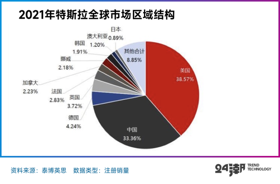 而反观特斯拉,2021年其海外(美国以外)销售规模占据整体销售比重高达62.43%,其中中国已经成为特斯拉第二大市场,2021年销售占比达33.36%。