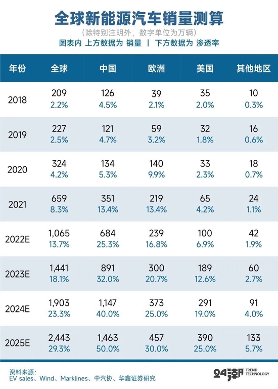毕竟中国新能源汽车市场持续的超预期增长,也意味着未来增长空间的缩窄。综合华鑫证券、中汽协等数据分析,2022年国内新能源汽车渗透率很可能突破至25%,这提前了整整三年完成了《新能源汽车产业发展规划(2021-2035年)》中要求的“在2025年新能源汽车市场渗透率达到20%左右”的战略目标。