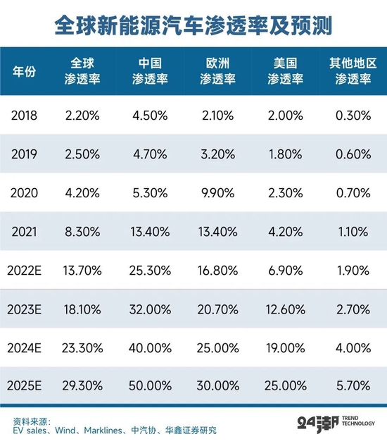 而2022年欧洲新能源汽车渗透率还不到20%,美国新能源汽车渗透率仅为个位数,其他国家及地区新能源汽车渗透率甚至不超过2%。相比之下,欧美等国家都拥有巨大的发展潜力。