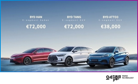 2022年9月,比亚迪在欧洲首发三款新车——ATTO3(元PLUS)、汉EV和唐,价格达到了3.8万欧元、7.2万欧元和7.2万欧元,折合人民币26.3万元、49.8万元和49.8万元。三款车比国内同款普遍贵出了10万元,也高于特斯拉Model 3/Y。
