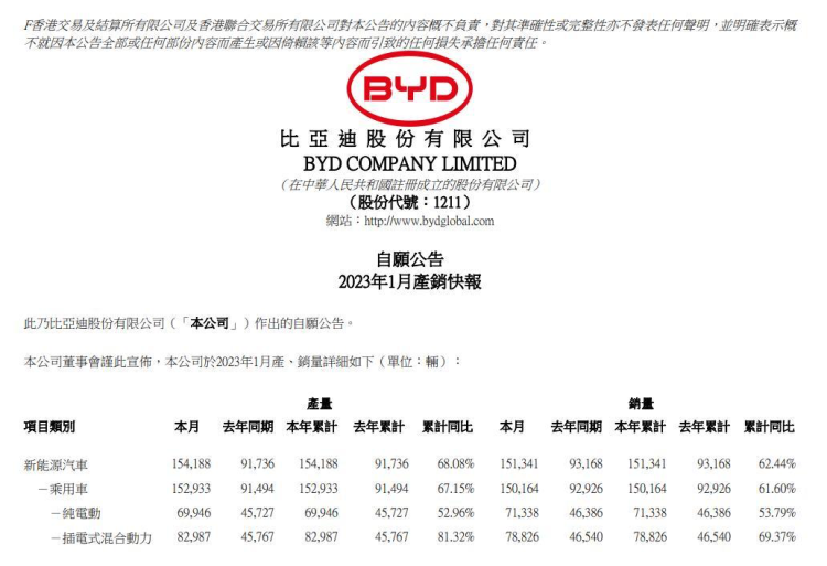 2月2日讯,比亚迪股份在港交所公告,1月新能源汽车销量15.13万辆,同比增长62.44%。其中,纯电动乘用车1月销量达71338辆,同比增长53.79%;插电式混合动力乘用车1月销量达78826辆,同比增长69.37%。