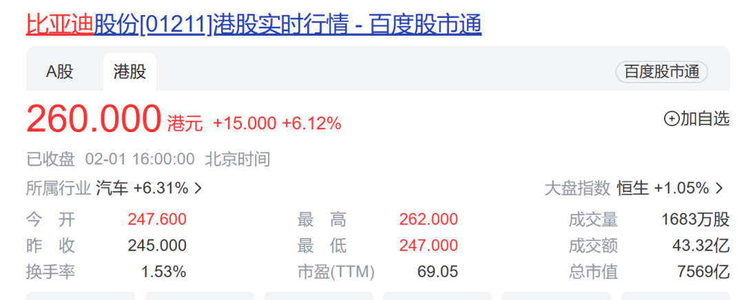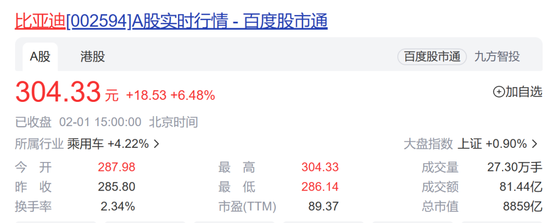 受此消息影响,2月1日,比亚迪AH股双双上涨,股价创5个月新高。其中,比亚迪A股报收304.33元/股,涨幅6.48%;H股报收260.00港元/股,涨幅6.12%。