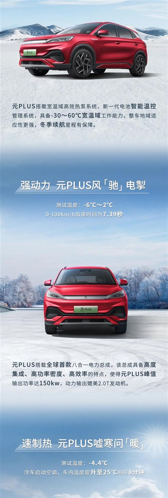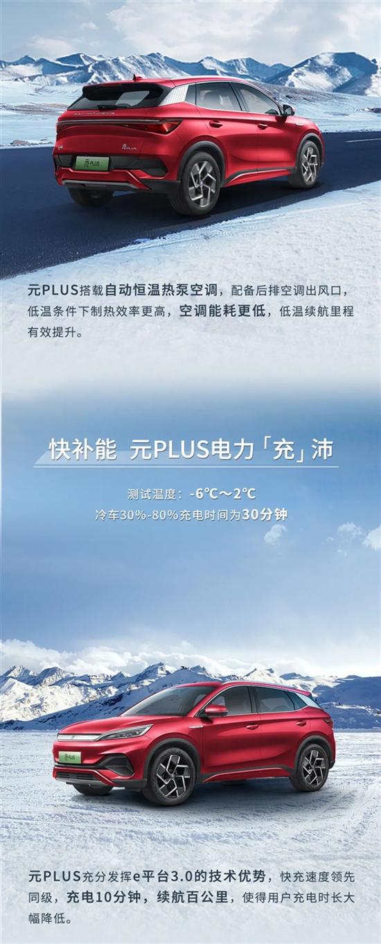 据了解,元PLUS搭载宽温域高效热泵系统、新一代电池智能温控管理系统,具备-30~60°C宽温域工作能力,整车地域适应性更强,冬季续航里程有保障。