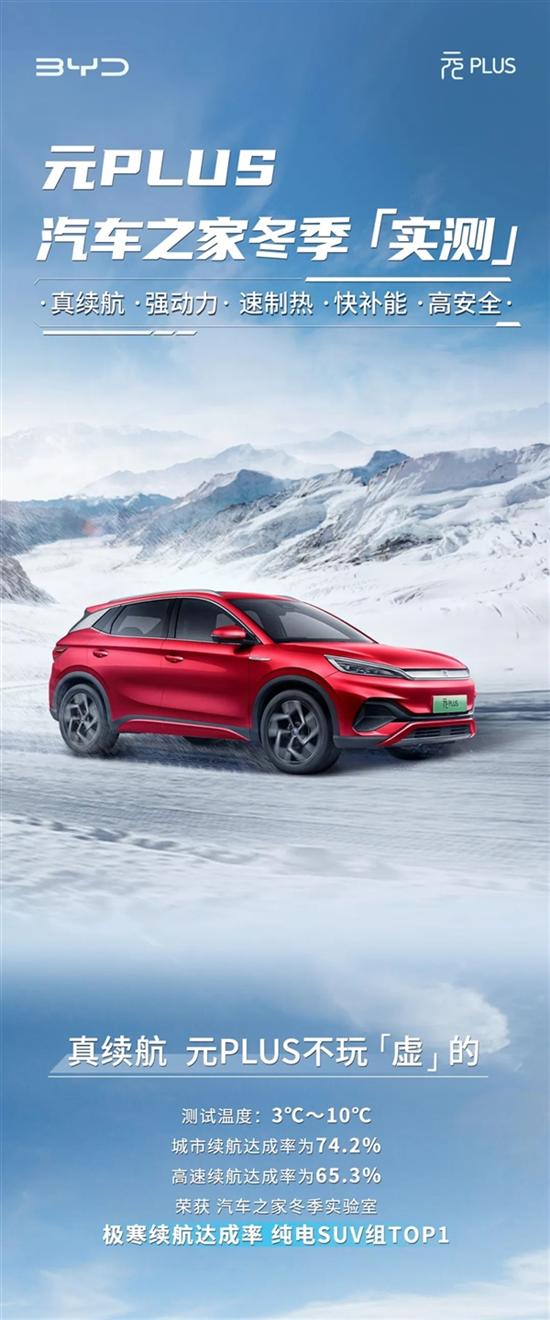 在汽车之家冬季“实测”中,比亚迪元Plus的极寒续航达成率斩获纯电SUV组第一。