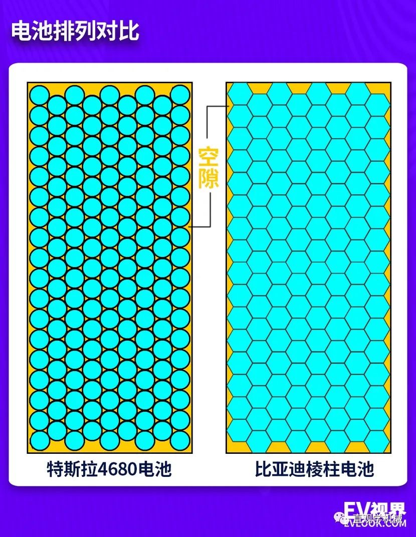 再说说不同点,首先,在结构强度上,4680圆柱单体电池一起组合时,相邻两个圆柱单体电池之间的空间较大,会使得圆柱电池组的机械稳定性不够,在受到外界振动或冲击时就有可能造成短路或破损现象,严重影响了车辆的安全。而六边棱柱体“4090电池”,在成组之后,形成了蜂窝状,可以使得电池单体之前没有缝隙,相当于“报团取硬”,由此提升了电池组的结构强度。