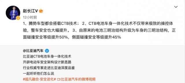 在测试后,吉林大学汽车研究院院长管欣表示,“比亚迪CTB技术解决了底盘操控稳定性开发、碰撞安全开发、车身结构开发等电动汽车设计过程中的诸多难题,体现了比亚迪成熟驾驭汽车各种产品方察的创新能力。”