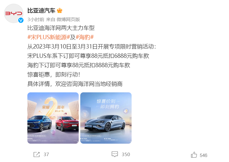 3月9日,比亚迪官微信息显示,3月10日至3月31日,比亚迪两大主力车型开展专项限时营销活动:宋PLUS车系下订即可享88元抵扣6888元购车款;海豹下订即可享88元抵扣8888元购车款,相当于减8800元。