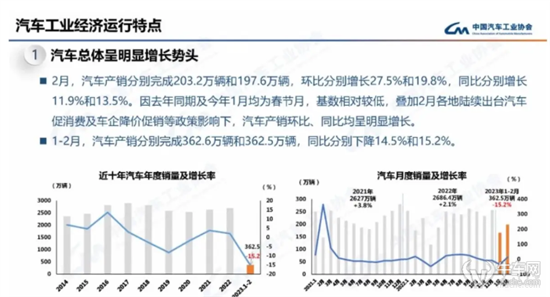 中国汽车工业协会发布了2023年2月汽车工业产销情况。今年2月汽车产销分别完成203.2万辆和197.6万辆,同比分别增长11.9%和13.5%。