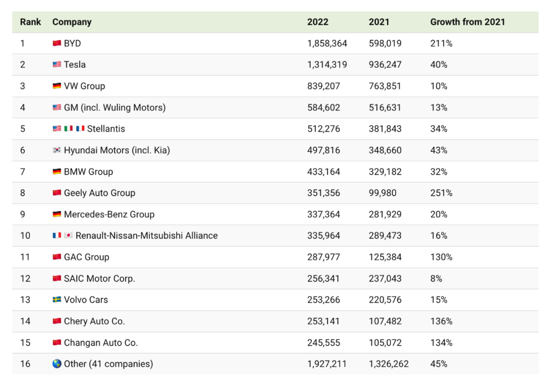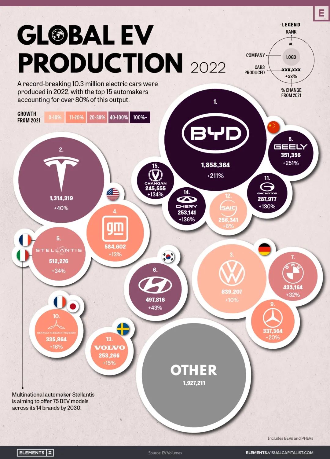 2022年是电动汽车的历史性一年,全球年产量首次超过1000万辆,比2021年的670万相比有了大幅增长。