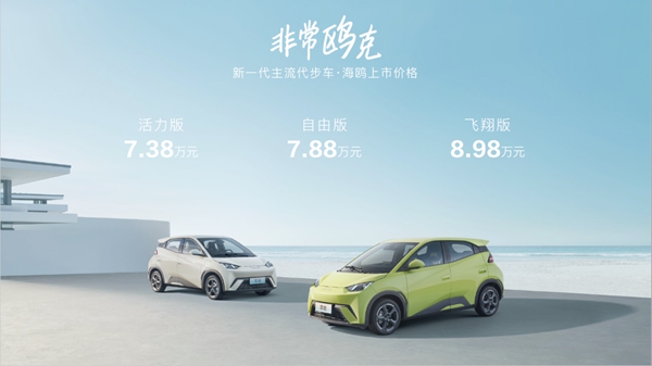 昨日,比亚迪旗下全新车型海鸥正式上市,售价区间为7.38万-8.98万元。作为一款入门级纯电小车,海鸥以高能属性超越了用户对车辆单一价值的期待,不仅补强了海洋网的产品矩阵,更成为比亚迪冲击全新市场空间的生力军。