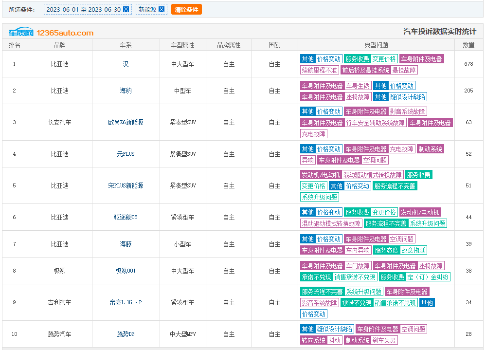 近日,新能源车企纷纷发布了6月份的新能源销量,其中比亚迪6月新能源汽车销量25.3万辆,依旧是汽车市场的主角,不但新车月销量高高在上,而且投诉量也是居高不下。据车质网显示,在6月投诉排行榜当中,比亚迪汉拿到第1,前十名中比亚迪占据7席(含子品牌腾势)!