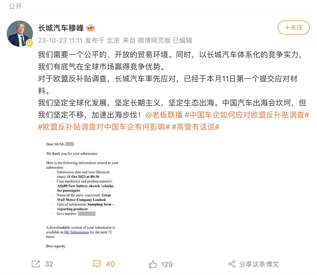 此外,长城汽车总裁穆峰在个人社交微博上透露,对于欧盟反补贴调查,长城汽车已经于11日第一个提交应对材料。穆峰称,公司需要一个公平的、开放的贸易环境。同时,以长城汽车体系化的竞争实力,公司有底气在全球市场赢得竞争优势。