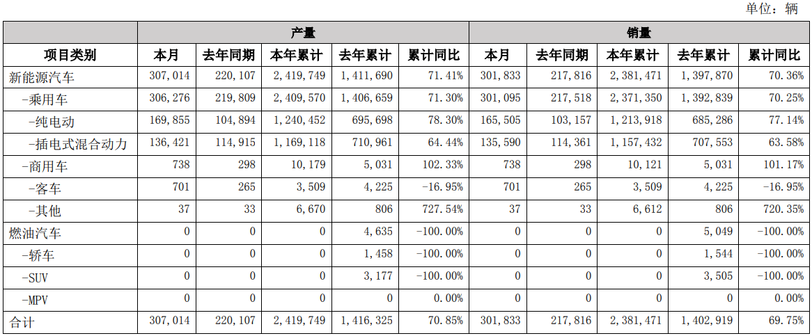 11月1日,比亚迪发布公告称,10月生产汽车307014辆,今年累计生产2419749辆,同比增长70.85%;10月销量为301833辆,环比增长5%,同比增长38.57%,今年累计销量2381471辆,同比增长69.75%。