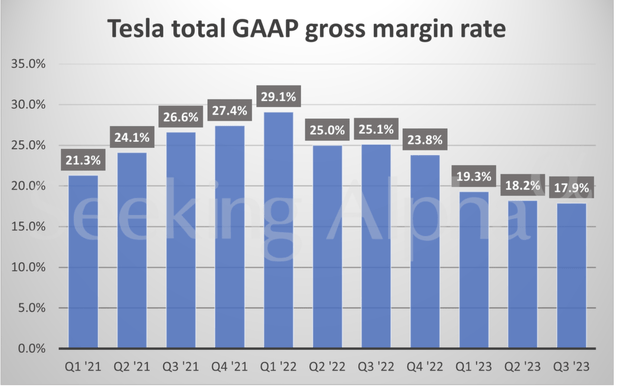 第三季度,特斯拉因设备重组和车型变更而出现了一些生产损失。总收入同比增长 9%,达到 234 亿美元。这对大多数公司来说已经足够健康,但对特斯拉的期望很高。结果导致股价大幅下跌。其营业利润下降至7.6%,但毛利率为17.9%。SA 报告的保证金历史如下图所示: