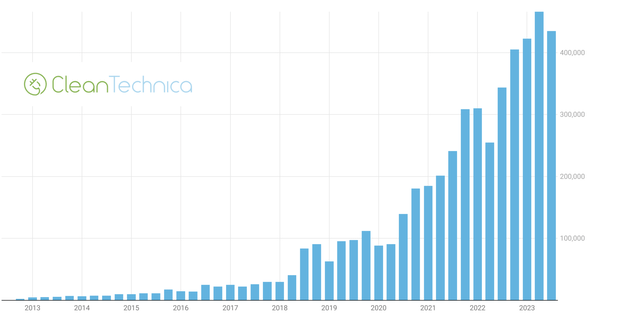 在美国,传统汽车陷入困境。2023年上半年,特斯拉在该国销售了325,291辆汽车。接下来的 19 家供应商售出了 214,542 辆汽车。第三季度,特斯拉的市场份额下降至 50%左右,而公司数量不断增加,产品范围不断扩大。随着市场的巨大扩张超出任何单一制造商满足需求的能力,市场份额将会下降。由于传统汽车的入侵,它不太可能下降。然而,对公司收入而言,重要的不是市场份额,而是总销售额。