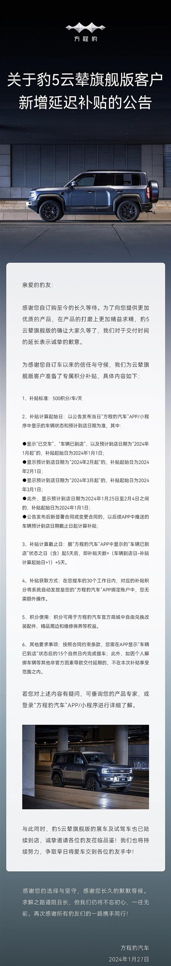 1月28日消息,近日比亚迪方程豹汽车表示,针对豹5云辇旗舰版的交付延迟深感抱歉,并将为客户提供500积分/车/天的专属积分补贴。